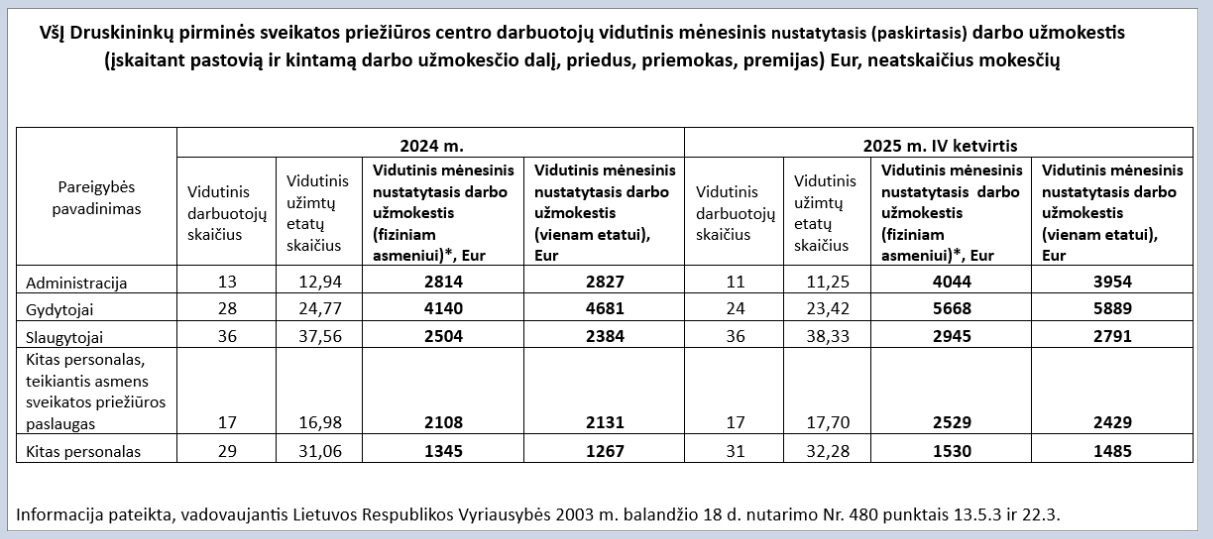 VšĮ Druskininkų pirminės sveikatos priežiūros centro darbuotojų vidutinis mėnesinis nustatytasis (paskirtasis) darbo užmokestis (įskaitant pastovią ir kintamą darbo užmokesčio dalį, priedus, priemokas, premijas) Eur, neatskaičius mokesčių
